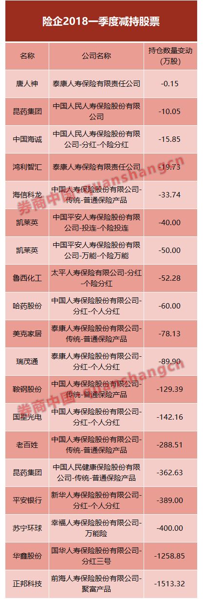 2018年一季度,在险企的股票减持单上,截至4月20日晚统计数据,共出现了17只股票。这17只股票分布的行业比较广,涵盖房地产业、化学制造业、服务业、计算机通信业、医药产业等多个行业。减持股数排名前三的包括:“前海人寿保险股份有限公司-聚富产品”坚持了1513万股正邦科技(4.01 -2.20%,诊股),“国华人寿保险股份有限公司-分红三号”坚持了1258.85万股华鑫股份(12.76 -9.95%,诊股),“幸福人寿保险股份有限公司-万能险”减持了400万股苏宁环球(3.98 +0.76%,诊股)。