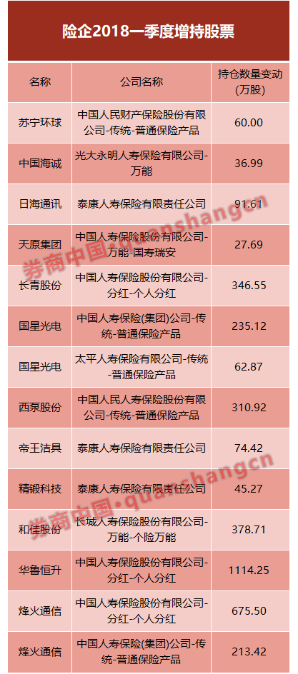 险企一季度增加持仓的12只股票则大部分集中在制造业和通信技术行业,相关股票达到12只,包括华鲁恒升、和佳股份(9.58 -1.64%,诊股)、烽火通信(26.19 +4.59%,诊股)、长青股份(13.60 -1.09%,诊股)、国星光电(18.23 -2.98%,诊股)等。