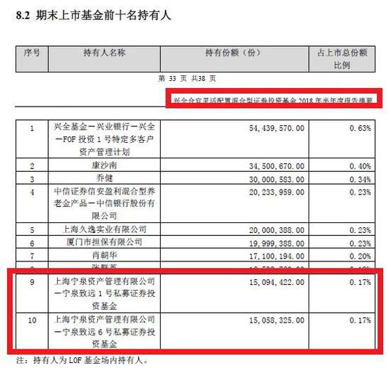 宁泉致远1号和6号分别名列兴全合宜基金场内持有人的第九和第十名,持有份额在1505.8万份到1509.4万份之间,按照当时0.9247元左右单位净值计算,则是1400万元左右。