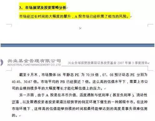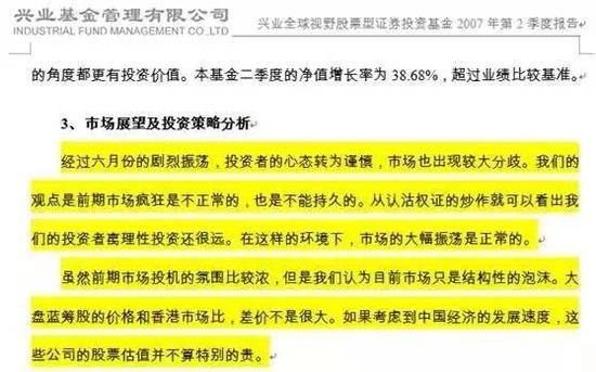 先看看2007年,2007年时,在众多基金公司通过大比例分红、拆分等方式去做大规模的同时,兴业全球旗下多只权益类基金宣布暂停申购。还有不少权益类基金在二季度报告中示警,如兴全全球视野二季度报告显示: