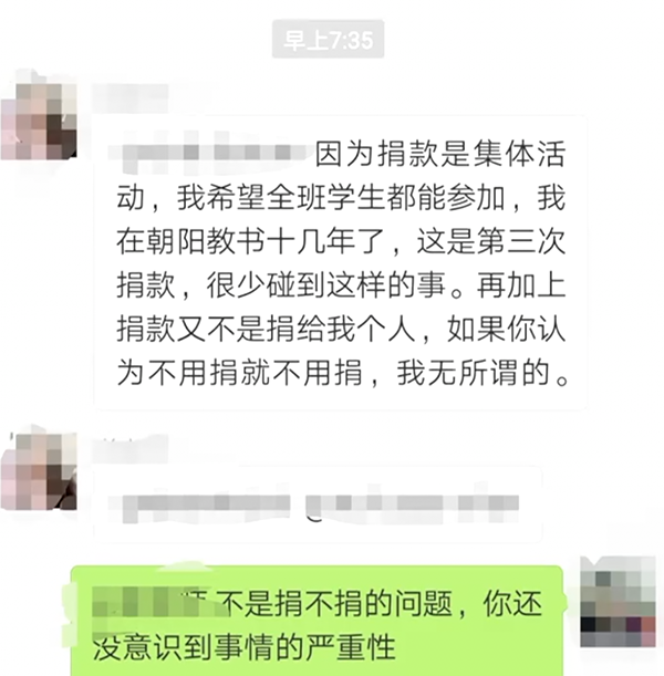 有几位家长随即在微信群里对老师的做法提出了异议,但反倒被老师教育了一番。而有的家长当即就在微信群里发了捐款红包。但事后就有家长担心,老师的这一做法可能会伤害孩子的自尊心。