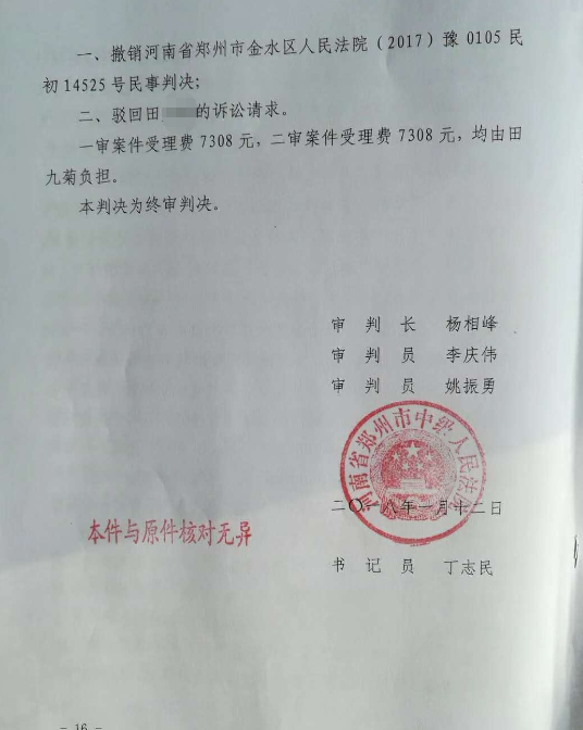 备受全国关注的“电梯劝烟猝死案”于1月23日在河南郑州市中级人民法院驻经开区综合审判庭二审公开宣判。记者从当事人劝阻吸烟者杨先生的代理律师处了解到,据(2017)豫01民终14848号判决书,法院驳回了死者家属田女士的诉讼请求,一审中判决杨先生补偿田女士1.5万元的判决结果也被纠正,一审二审共计1.4万余元诉讼费由田女士承担。(来源:封面新闻)