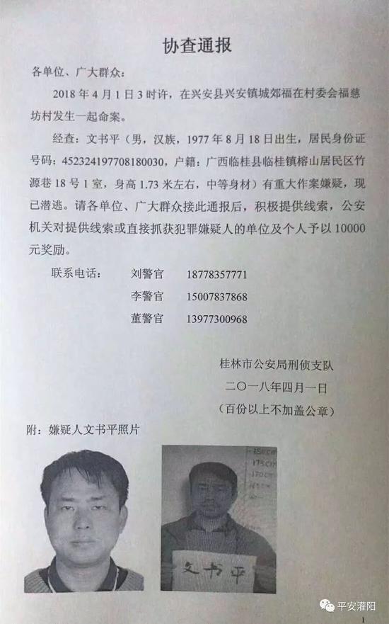 4月1日,兴安县公安局发出协查通报称,2018年4月1日3时许,在兴安县兴安镇城郊福在村委会福慈坊村发生一起命案。经查:文书平(男,汉族,1977年8月18日出生,居民身份证号码:452324197708180030,户籍:广西临桂县临桂镇榕山居民区竹源巷18号1室,身高1.73米左右,中等身材)有重大作案嫌疑,现已潜逃,请各单位、广大群众接此通报后,积极提供线索,公安机关对提供线索或直接抓获犯罪嫌疑人的单位及个人予以10000元奖励。