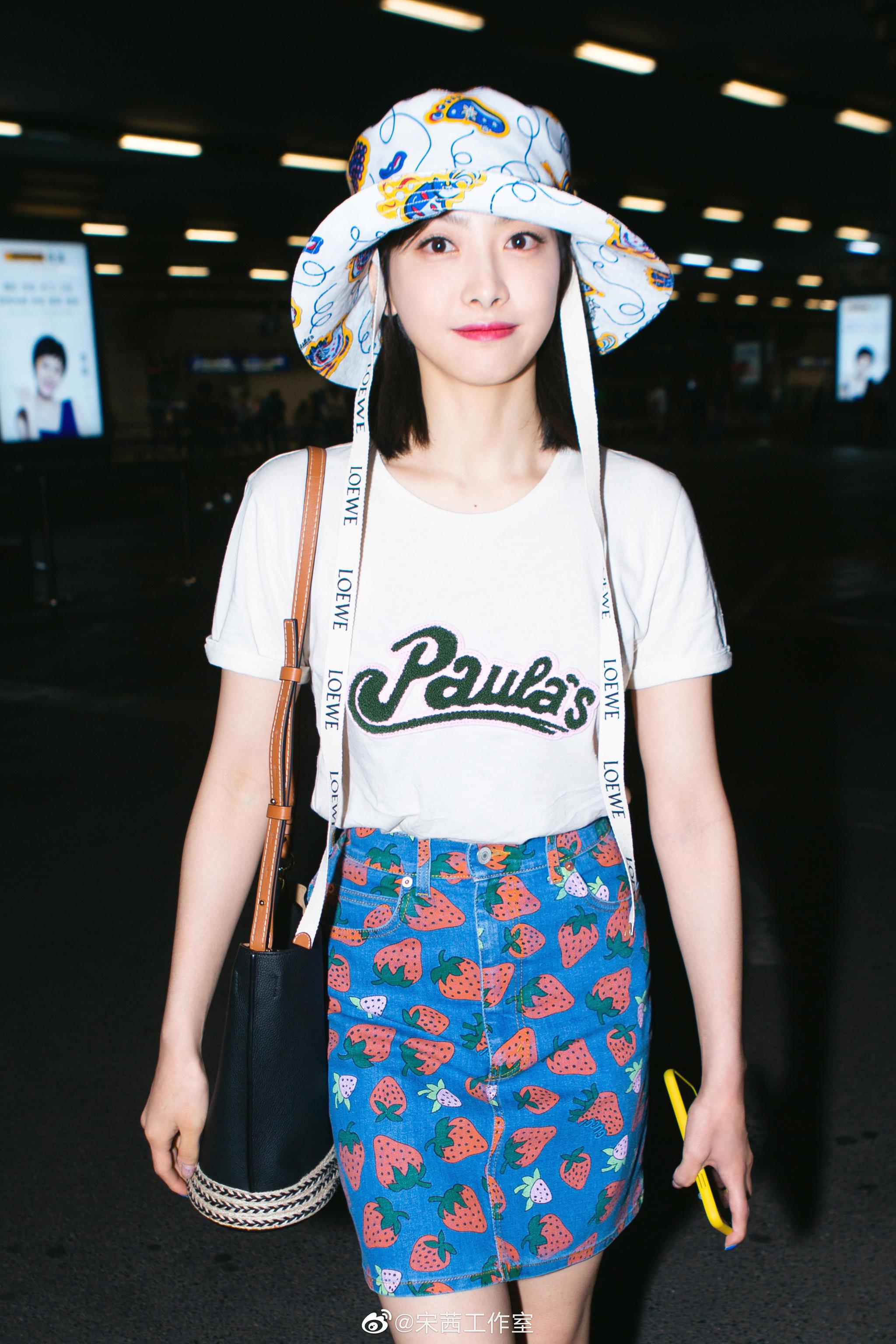 带有手绘涂鸦的渔夫帽就是不错的选择,宋茜就恰到好处地将LOEWE的渔夫帽和GUCCI的草莓短裙相搭配,童趣又有活力。