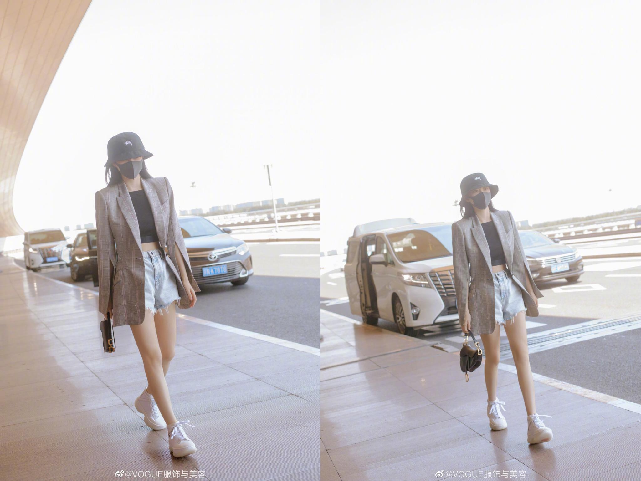 渔夫帽比较常见的颜色就是黑、白两色。黑色给人一种低调的时尚感,可以中和整体造型中过于鲜艳的颜色。景甜这身黑色渔夫帽与格子西装外套的搭配,简约大方又尽显帅气利落。