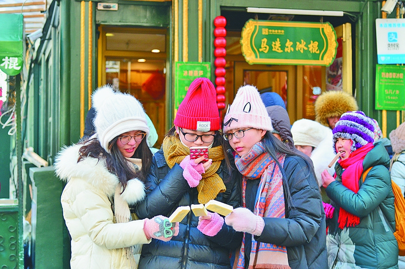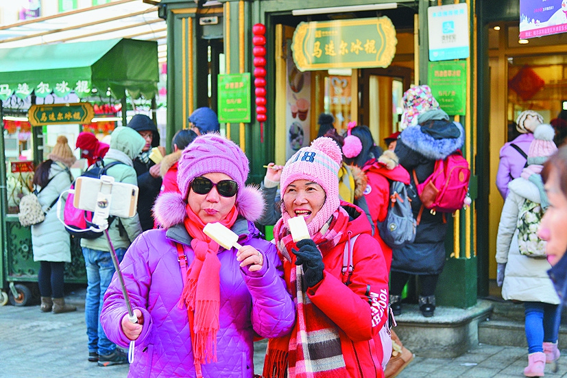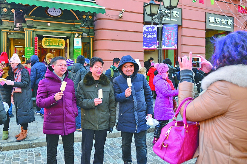 18日,随着冰城旅游旺季的到来,南方游客纷纷来到中央大街游玩,三九天吃冰棍一定要拍照留念哦!
