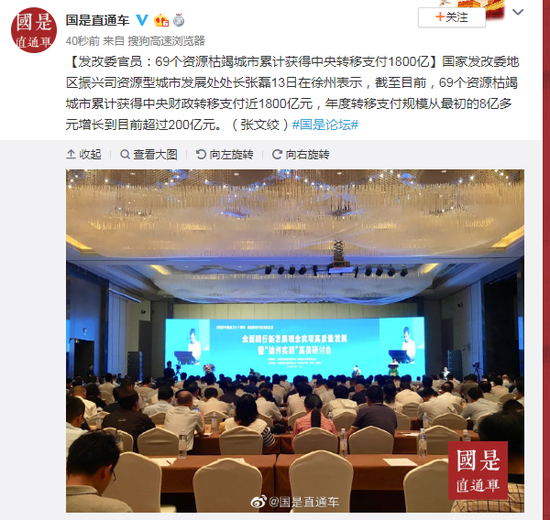 [发改委官员:69个资源枯竭城市累计获得中央转移支付1800亿]国家发改委地区振兴司资源型城市发展处处长张磊13日在徐州表示,截至目前,69个资源枯竭城市累计获得中央财政转移支付近1800亿元,年度转移支付规模从最初的8亿多元增长到目前超过200亿元。