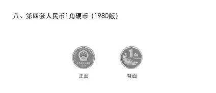 (八)第四套人民币1角硬币。其材质为铝镁合金,正面图案为国徽、国名、汉语拼音国名、年号,背面图案为菊花、面额。