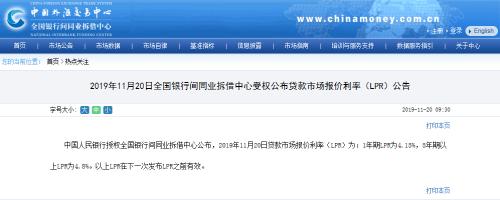 中国人民银行授权全国银行间同业拆借中心公布,2019年11月20日贷款市场报价利率(LPR)为:1年期LPR为4.15%,5年期以上LPR为4.8%。1年期和5年期LPR均较9月报价下行5个基点。